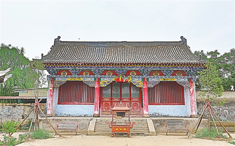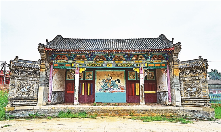 村委東院就是坐北朝南的關(guān)帝廟,始建于清晚期,進(jìn)深四椽,正殿磚砌臺(tái)基,面寬三間,單檐懸山頂,五檁前出廊式梁架,柱頭斗公式三踩單昂,明間設(shè)四扇六抹隔扇門(mén),次間設(shè)直欞窗。殿中有關(guān)帝坐像,神閣前是一長(zhǎng)條供桌和香爐,關(guān)平、周倉(cāng)分立兩旁。正殿兩旁各一耳房,東西各兩間上廂房緊挨著兩間下廂房,下廂房比上廂房低一尺多。院兩側(cè)有鐘鼓樓。關(guān)帝廟西有一小院,有正房、西房,供財(cái)神、河神。