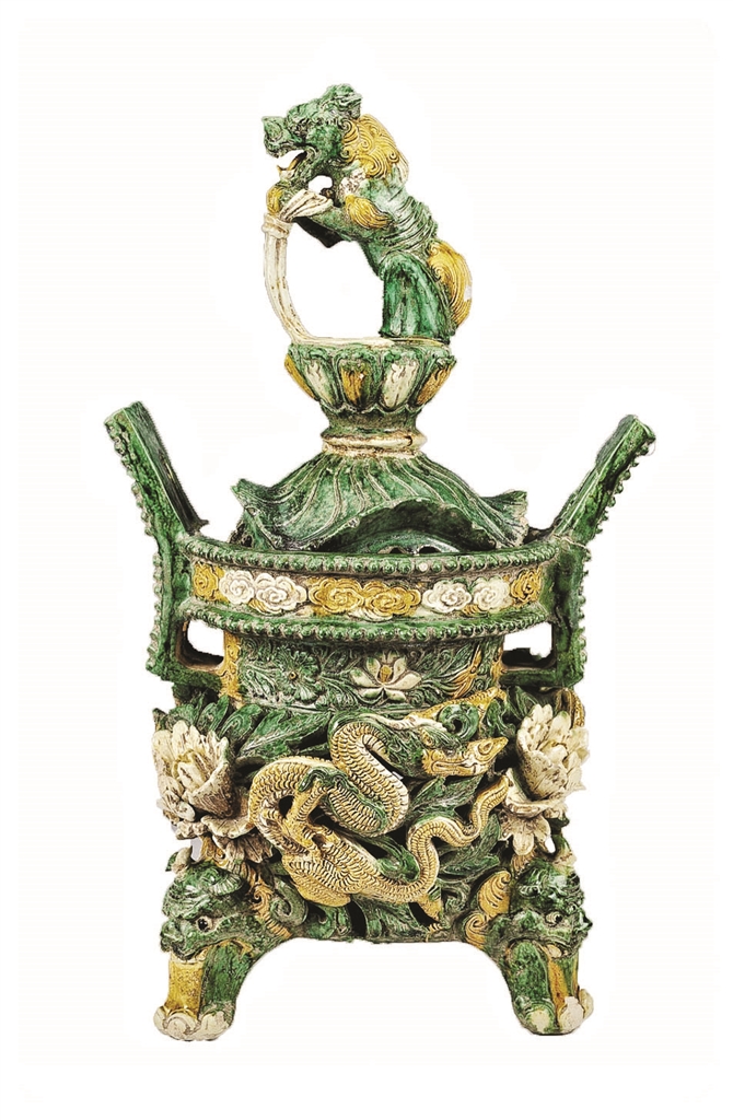 山西博物院藏有一件綠釉琉璃蓮蓬蹲獅香爐,國家一級文物。綠釉琉璃蓮蓬蹲獅香爐,通高57厘米,口徑24厘米。1982年,在現(xiàn)呂梁市離石區(qū)永寧中路市委大院,市財(cái)政局修建辦公樓時(shí)一地下深埋的大黑甕中窖藏出土。該爐用紅坩土塑制,遍施黃、綠釉,色彩艷麗,凝重大氣。腹部鏤空雕龍戲牡丹,龍?bào)w壯碩,趾爪有力,氣勢威猛,牡丹花朵肥大,荷葉蓮蓬爐蓋,蓮蓬上雄獅人立戲耍,雙耳外撇,三獨(dú)角獸足粗壯穩(wěn)健,造型殊異。爐口內(nèi)沿刻有:“已丑年壬申月已酉日辛?xí)r朱成造”銘文,耳上刻有“呼延”二字,是元末明初單體琉璃中的經(jīng)典之作。