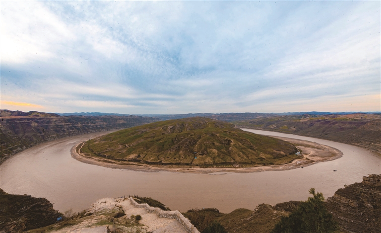 萬里黃河,在這里轉(zhuǎn)了一個(gè)360度的彎。原本無羈的黃河,在這里此時(shí)顯得非常地溫順。青山遮不住,畢竟南流去。再彎的峽谷,再厚的山峰,也阻擋不住,黃河遠(yuǎn)去的豪邁氣勢。同行的梁繼國老師面對大自然鬼斧神工的力量所造就的壯觀景象,不斷地感嘆:每個(gè)人在永恒的大自然面前,顯得多么得渺小而短暫??!石樓辛中有詩贊美道: