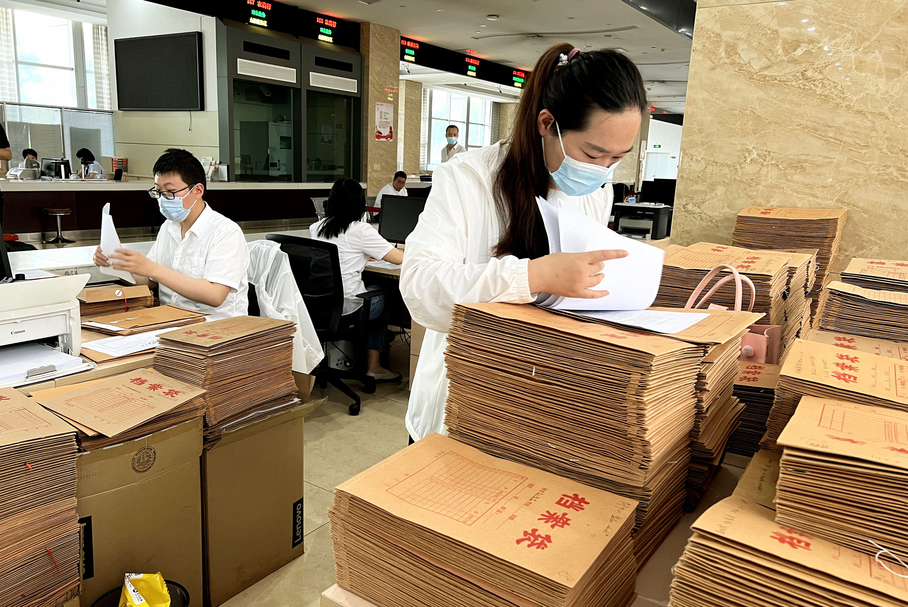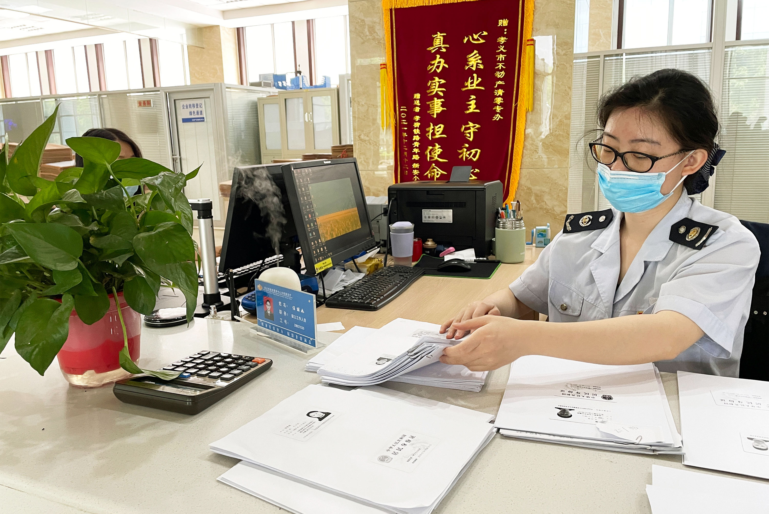“不動(dòng)產(chǎn)清零”專辦窗口工作人員在查閱業(yè)主資料
