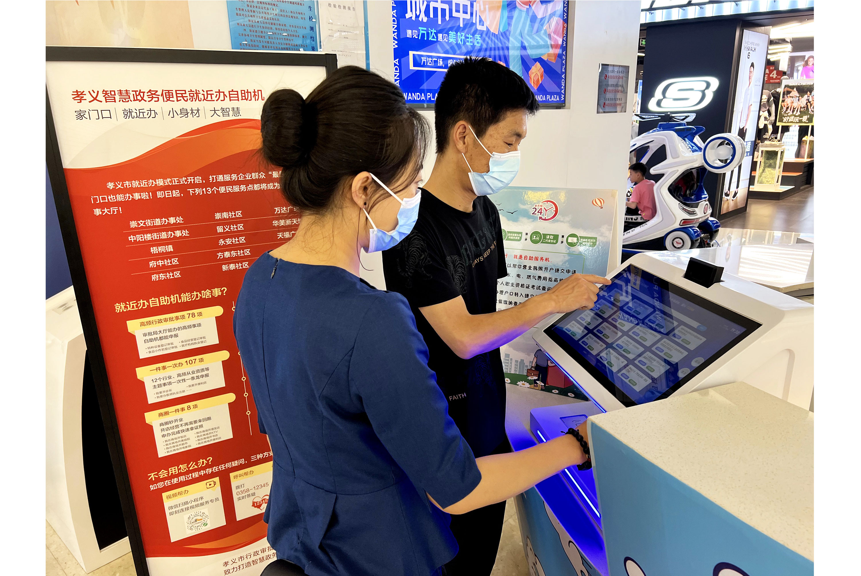 工作人員指導(dǎo)群眾就近使用智慧政務(wù)服務(wù)一體機(jī)便捷辦理業(yè)務(wù)