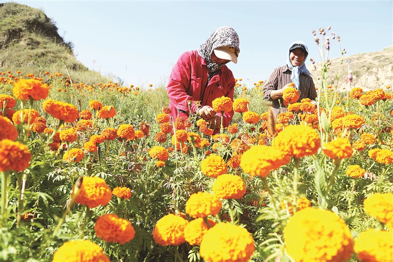 9月4日,農(nóng)民在甘肅省定西市隴西縣馬河鎮(zhèn)賀家川村采摘萬壽菊。