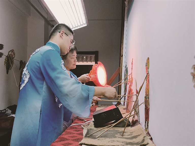 燈光漸暗、音樂(lè)響起,白色幕布上精巧別致的人、物圖像出現(xiàn)了,兩位幕后表演者的操作下,孫悟空、豬八戒、柳樹精、小鬼等角色粉墨登場(chǎng),每個(gè)造型仿佛被賦予了生命,動(dòng)作自如,上天入地、無(wú)所不能,神奇的光影世界妙趣橫生,惹得人們紛紛駐足觀看。