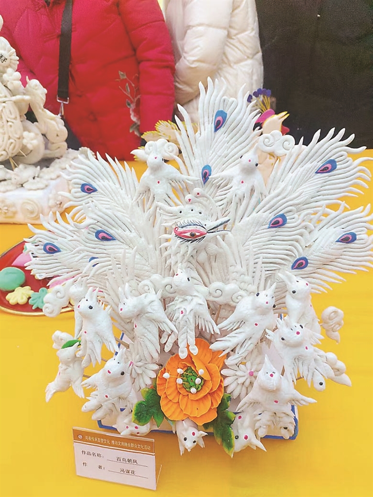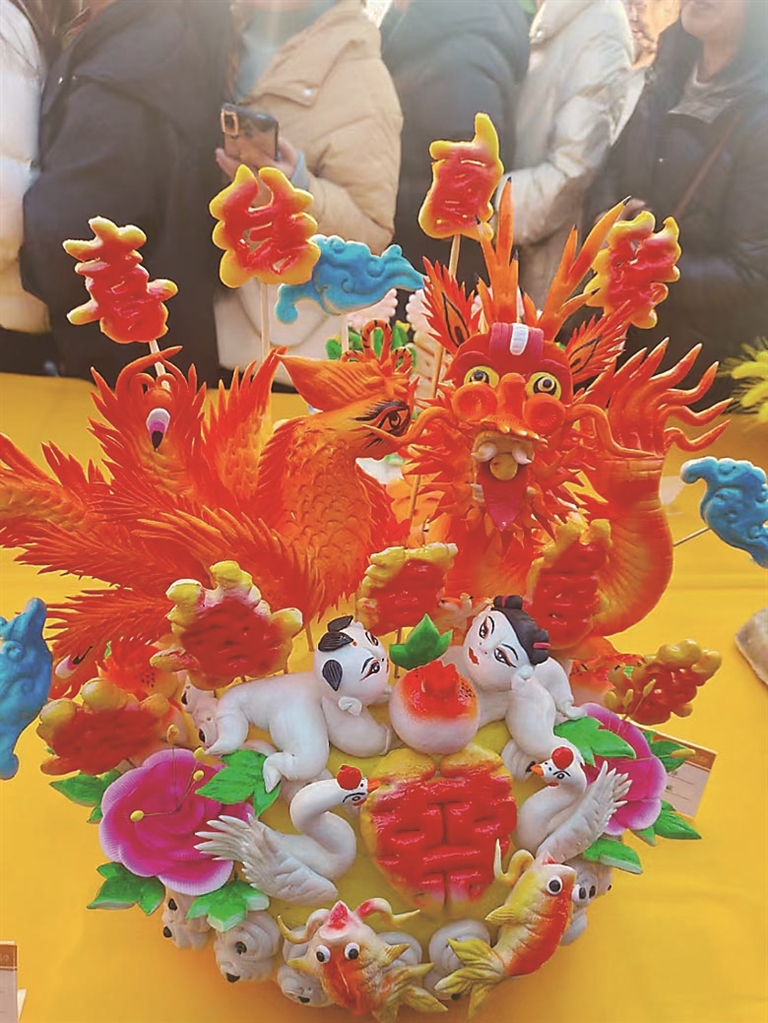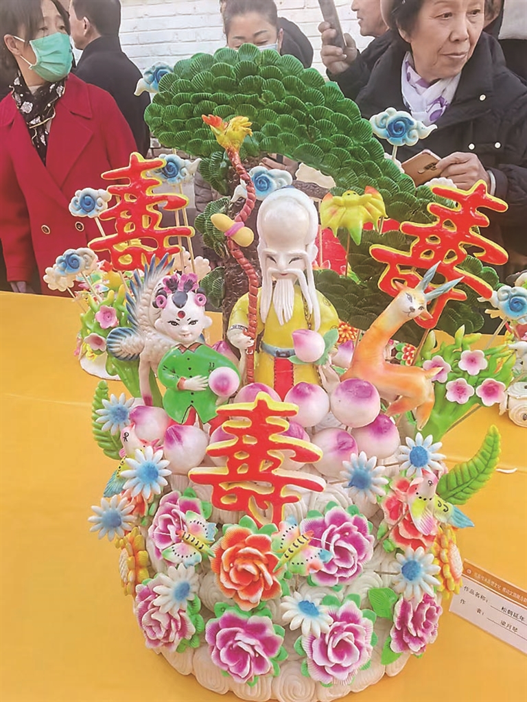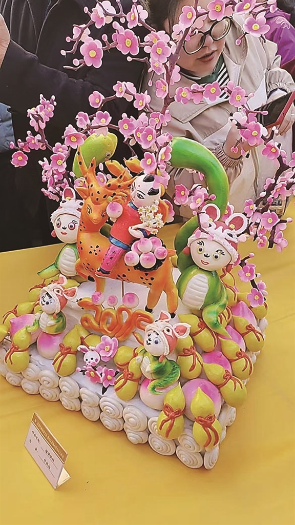 嵐縣面塑的分類細(xì)致入微,風(fēng)格迥異,可分為三大類:其一是點(diǎn)飾祈福,如象征婚育繁衍的羅漢漢、爬孩孩,象征幸福生活蒸蒸日上的棗山;其二是簡飾美食,如年節(jié)兒童食品蛇燕燕、花卷卷、紅點(diǎn)年饃;其三是裝飾展示,美吃美看,營造氛圍,如用于喪葬祭祀的八仙過海,用于喜慶祝壽的喜鵲登梅等。隨著時代的發(fā)展,藝人們還在面塑作品中增加了具有時代性、創(chuàng)新性的內(nèi)容,如黑神話悟空、魔童哪吒等,讓古老的面塑煥發(fā)出新的活力。