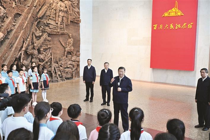 在紀念館大廳,習近平同前來參觀的青少年學生和紀念館工作人員親切交流。他說,88年前的今天發(fā)生的“七七事變”,是中華民族全面抗擊日本侵略者的起點,前事不忘、后事之師,到這里來就是接受精神洗禮。廣大青少年生逢其時,要賡續(xù)紅色血脈,樹立強國有我的遠大志向,做堂堂正正、光榮自豪的中國人,勇?lián)褡鍙团d的時代大任。