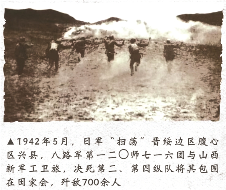 田家會(huì)戰(zhàn)斗是1942年晉西北反“掃蕩”中以少勝多的光輝戰(zhàn)例。5月中旬,日偽軍700余人奔襲晉西北軍區(qū)機(jī)關(guān)。14日,日軍沿嵐興公路急進(jìn),遭八路軍在吳家溝、雜石溝阻擊,2名偽軍被俘。日軍15日拂曉隱蔽于李家莊密林,晉西北軍區(qū)部署部隊(duì)監(jiān)視待機(jī),嚴(yán)陣以待。16日,日軍試探出擾被擊退,當(dāng)夜繞道急進(jìn)興縣。17日拂曉進(jìn)占空城后撤退,在白家堰遭工衛(wèi)旅阻擊。軍區(qū)抓住戰(zhàn)機(jī),令716團(tuán)晝夜回師,與興縣游擊大隊(duì)埋伏于二京山。18日,日軍突圍至二京山,遭716團(tuán)痛擊,先頭部隊(duì)被殲大半。日軍逃竄至龍尾峁,八路軍搶占高地圍堵,經(jīng)白刃戰(zhàn)重創(chuàng)敵人。日軍黃昏后突圍,遭358旅追擊,在田家會(huì)附近再度被包圍。19日,八路軍發(fā)起總攻,大部日軍被殲,殘敵逃竄中又遭截?fù)?,最終狼狽逃回普明。田家會(huì)戰(zhàn)斗中八路軍共殲敵1300余人,俘虜日軍24人、偽軍21人,繳獲戰(zhàn)馬355匹、牲畜155頭,山炮1門,還有各種槍支、彈藥和用品。
