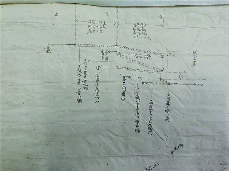 白家墕地洞打得較好。在今年一月份敵人大掃蕩的那次,老百姓四處逃跑,這使得老百姓有的逃到河西,有的跑到敵占區(qū)附近,有些老百姓和民兵不愿意跑,即藏該村舊地洞中。一月七日,敵就來這個(gè)地洞內(nèi),老百姓把鍬镢頭一齊舉動(dòng),亂砍亂響,叫喊時(shí)很高,敵人在外面就說:“這里有機(jī)關(guān)槍,八路軍,不敢過去?!睌橙俗吡死习傩站蜕塘浚窈笠谶@就得把地洞修理一下,回來商量就開始了。在十二丈高崖的半山中間,開著洞口先往地下打,六七丈高,然后開口,開口一丈多深,就向上打了二丈深的胡蘿卜窯洞則,然后一面平平向后。打了十二丈,旁邊打了橫窖則八個(gè),向外打出兩個(gè)口子,一為槍眼,亦頂氣眼。一為廁所,又頂個(gè)槍眼,高四尺五丈,這個(gè)工程還不大,每天四個(gè)工,共打了卅二天,合計(jì)為一百八十個(gè)工。