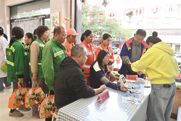 “之前總覺得腰不舒服忍忍就過去了,今天才知道是姿勢不對導(dǎo)致的勞損,還學會了幾個拉伸動作,太實用了!” 環(huán)衛(wèi)工人吳翻娥忍不住和身邊的同事分享。宣講結(jié)束后的義診環(huán)節(jié),更是人氣十足,醫(yī)護人員擺開血壓儀、血糖儀,為到場的戶外勞動者逐一檢查身體,并針對每個人的身體狀況耐心分析,提供個性化健康建議——從飲食調(diào)理到作息安排,從職業(yè)病預(yù)防到用藥指導(dǎo),讓勞動者在家門口享受到便捷醫(yī)療服務(wù)。