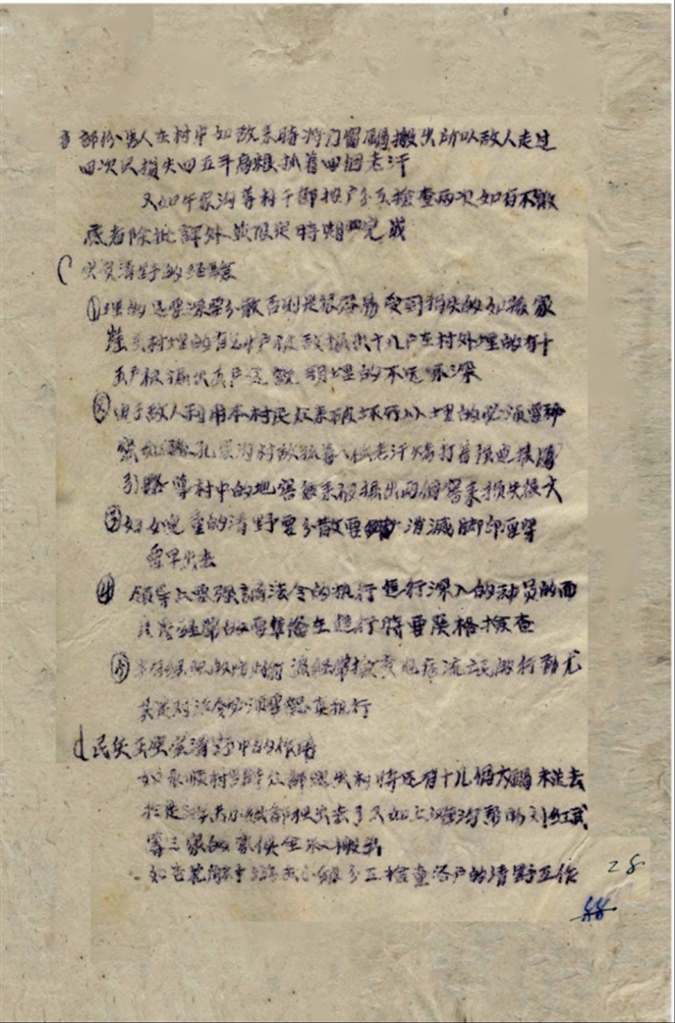 在戰(zhàn)前公糧工作當中曾經(jīng)廣泛的進行過這一工作,又加以群眾對敵人殘暴有了深刻的認識(另一方面由于各級干部對這法令的認真執(zhí)行)所以大家的食糧等重要物品早已有了充分的準備。又如寨大村在秋收時打下一些就埋藏一下,此次敵人住了三天掘了很多窖,僅損失一石一斗。又如白家寨村白自尚在秋收時埋在院一丈多深,在地面上又沒有痕跡,所以一點也沒有損失。又如上灘溝村財政令長家事先埋了一丈多深,敵人掘了三尺多沒有掘出來。