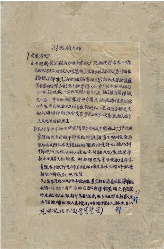 對于空舍清野工作的領(lǐng)導檢查??h區(qū)村各級空舍清野工作都由各級戰(zhàn)時工作委員會負領(lǐng)導檢查推動之責;各自然村由行政村戰(zhàn)工會選擇一堅強干部專負空舍清野檢查督促之責。