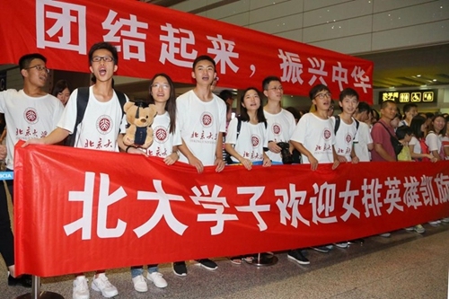 2016年,北大學(xué)子在機(jī)場迎接女排隊員回國,再次豎起了“團(tuán)結(jié)起來,振興中華”的口號。