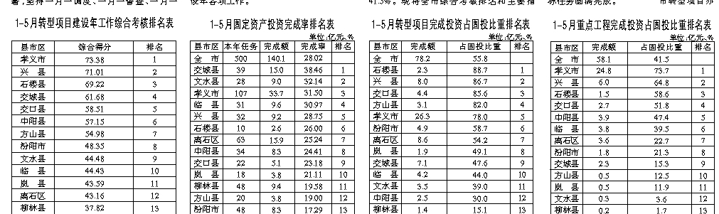 1-5月,全市固定資產(chǎn)投資完成140.1億元,完成全年投資任務(wù)的28%。其中轉(zhuǎn)型項目完成投資78.2億元,占固定資產(chǎn)投資的比重為55.8%;省市重點工程完成投資58.1億元,占固定資產(chǎn)投資的比重為41.5%?,F(xiàn)將全市綜合考核排名和主要指標(biāo)完成情況予以通報,各縣(市、區(qū))和市直有關(guān)部門要高度重視,正視工作差距,力克工作難點,強(qiáng)化要素保障,努力形成上下協(xié)同、橫向聯(lián)動、齊抓共管的格局,助推高質(zhì)量轉(zhuǎn)型發(fā)展取得新突破,確保全年各項目標(biāo)任務(wù)圓滿完成。 市轉(zhuǎn)型項目辦