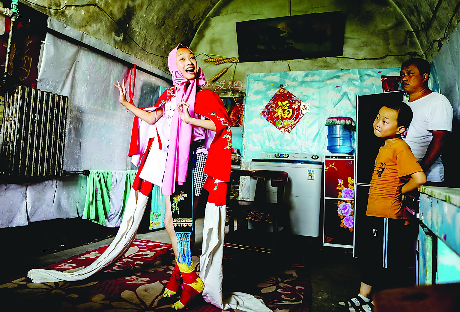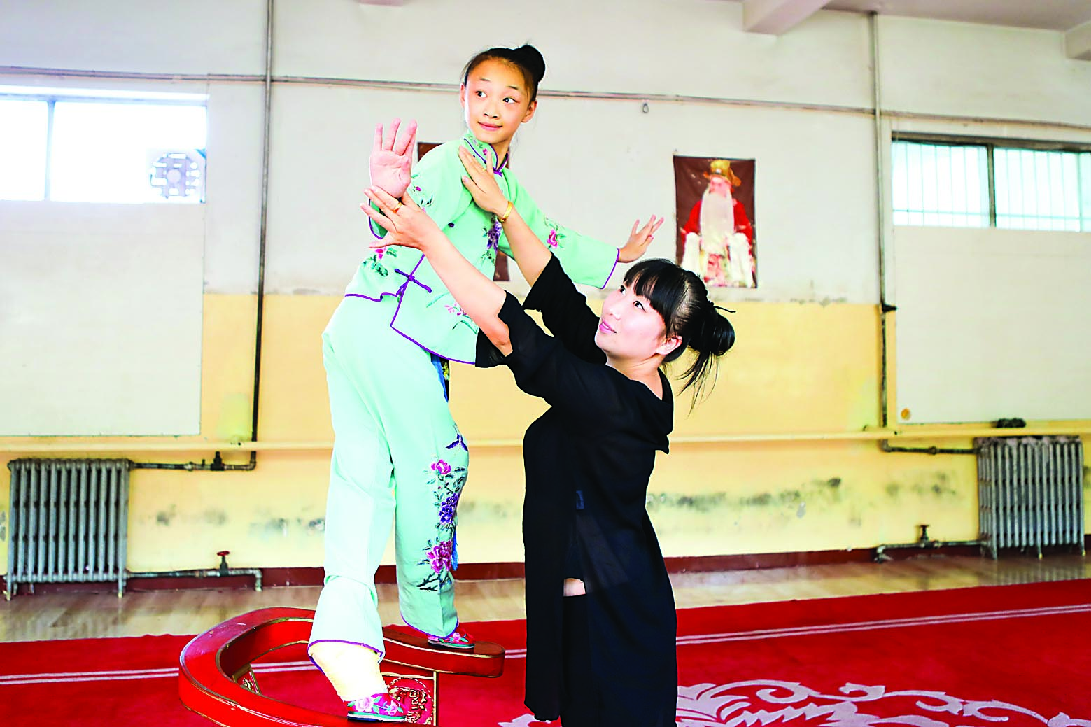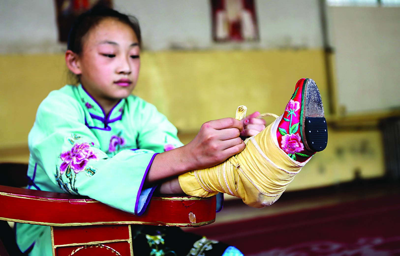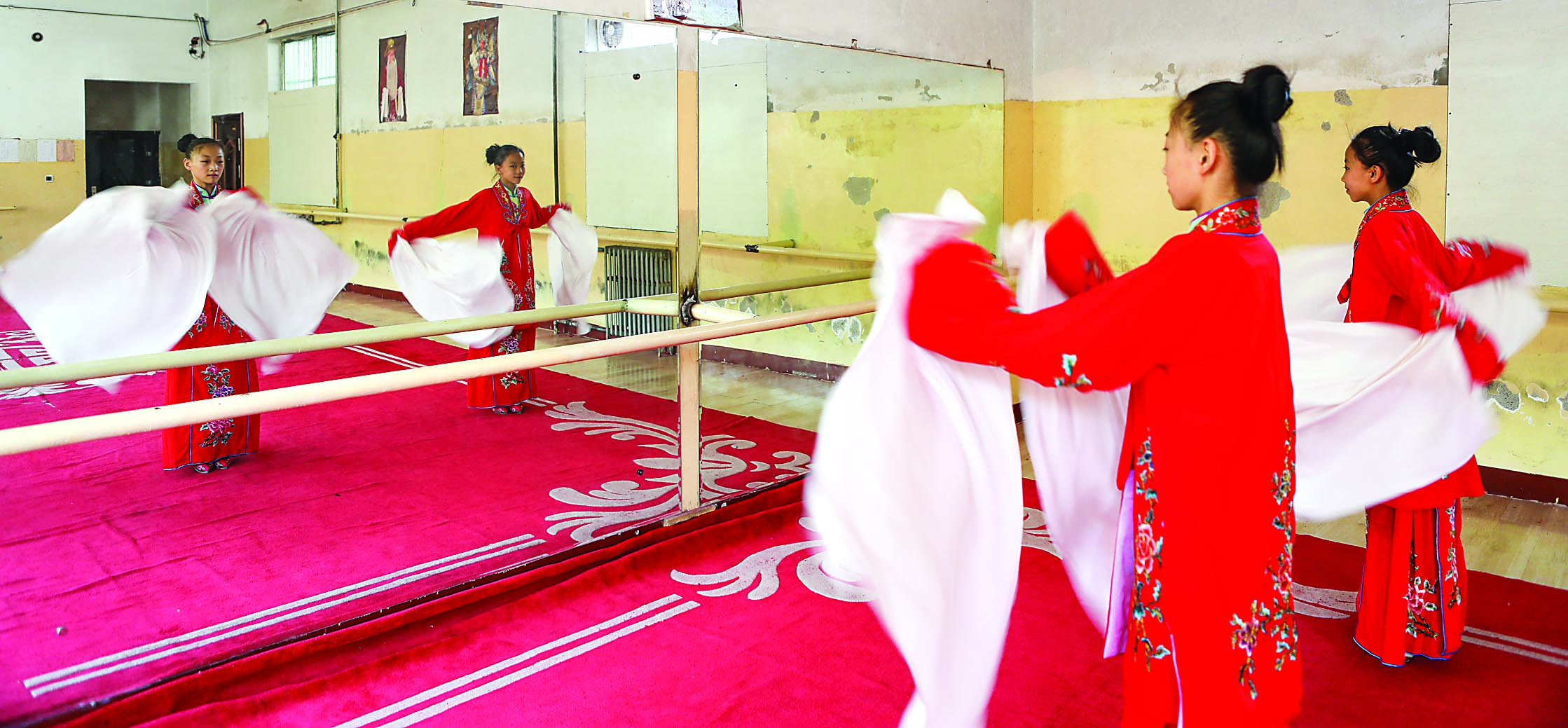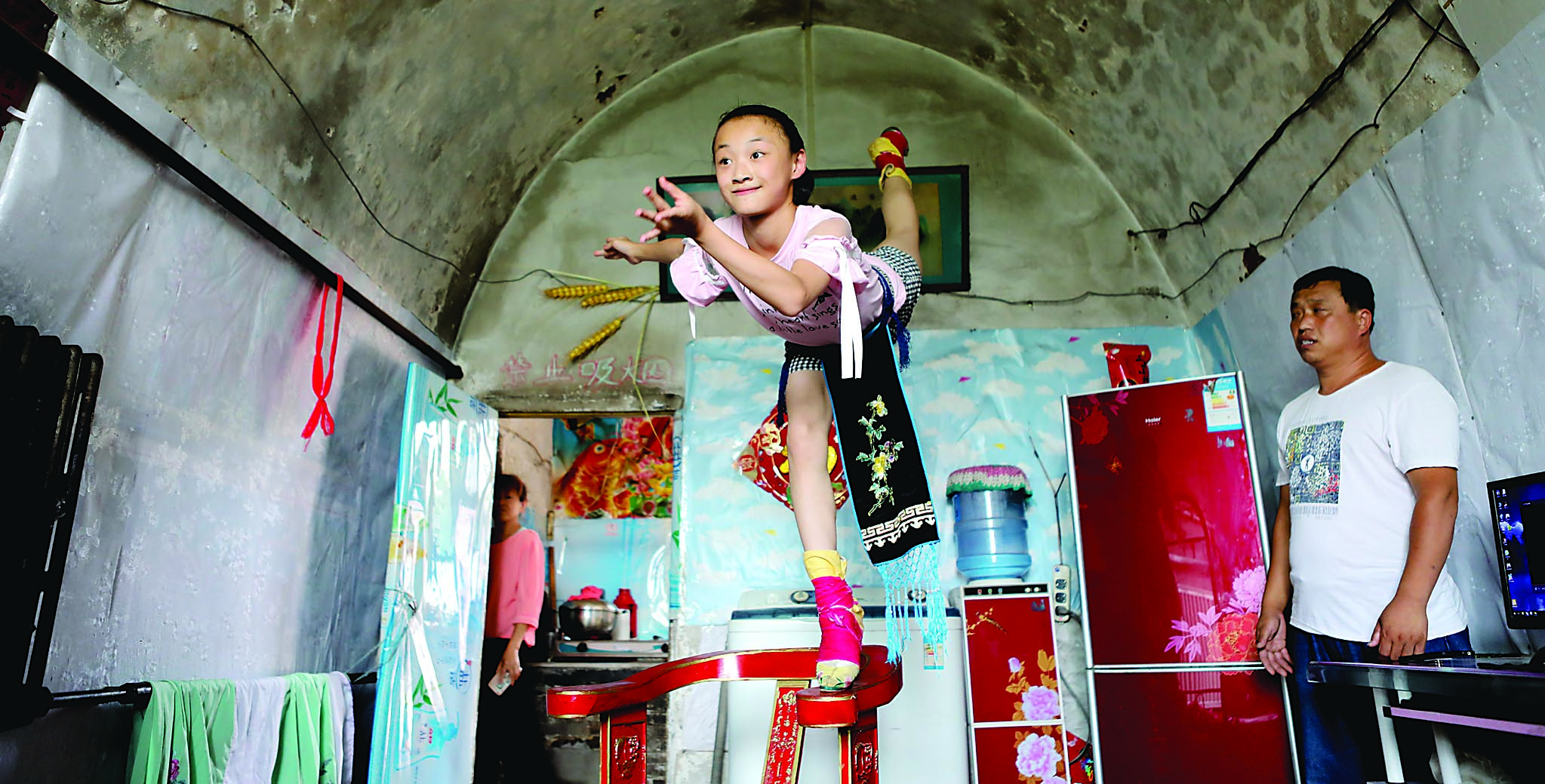 “你看她布置新房時(shí),要掛畫卻又夠不著,便讓丫鬟搬過一個(gè)椅子,她十分興奮,腰一扭,膀一搖,一步躥上了板凳,穩(wěn)穩(wěn)地站在凳上。”記者一邊觀看表演,一邊聽著一旁的指導(dǎo)老師雒芳芳解說劇情。表演中,只見孟怡宣腳踩三寸蹺鞋,單腳踩在椅子的上沿,做著訂釘、掛畫等高難度形體動作,身段是那樣美,功夫是那樣深,令人驚嘆。