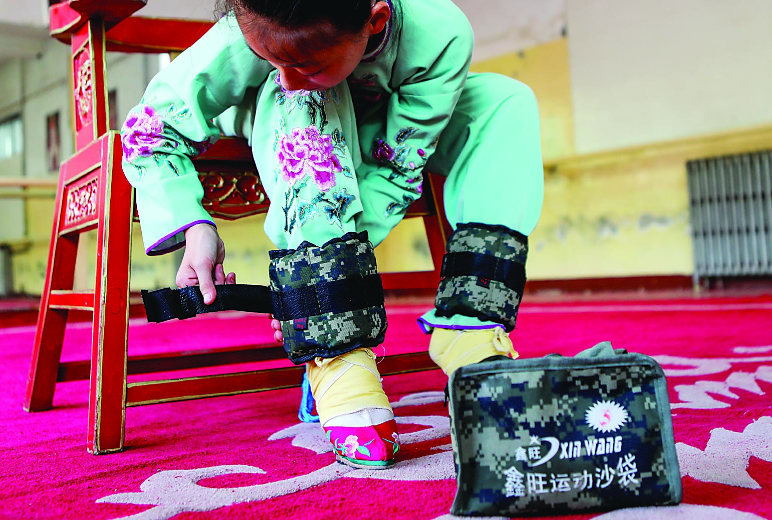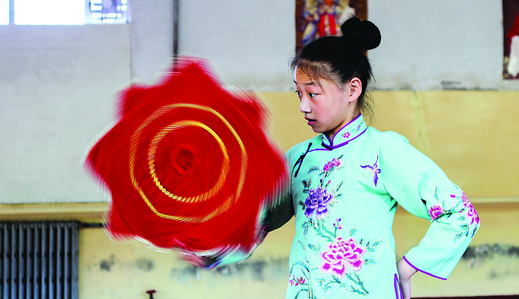 這折在舞臺上不過短短八分鐘的戲,孟怡宣排練了整整一年。兩年前,孟怡宣進(jìn)入?yún)瘟核囆g(shù)學(xué)校,成為戲曲班的一員。撕腿、搬腿、踢腿、下腰……經(jīng)過一年的基本功練習(xí)后,開始學(xué)習(xí)表演劇目《雙掛畫》。