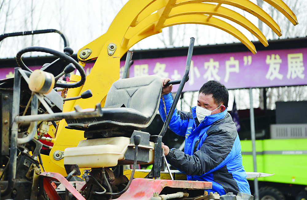 2月27日,河北省定州市信聯(lián)農機專業(yè)合作社農民在檢修農機。