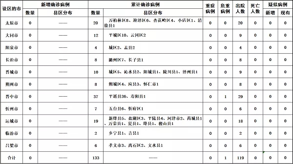 截至3月2日24時,山西省11個市累計(jì)報告新型冠狀病毒感染的肺炎確診病例133例。其中:
