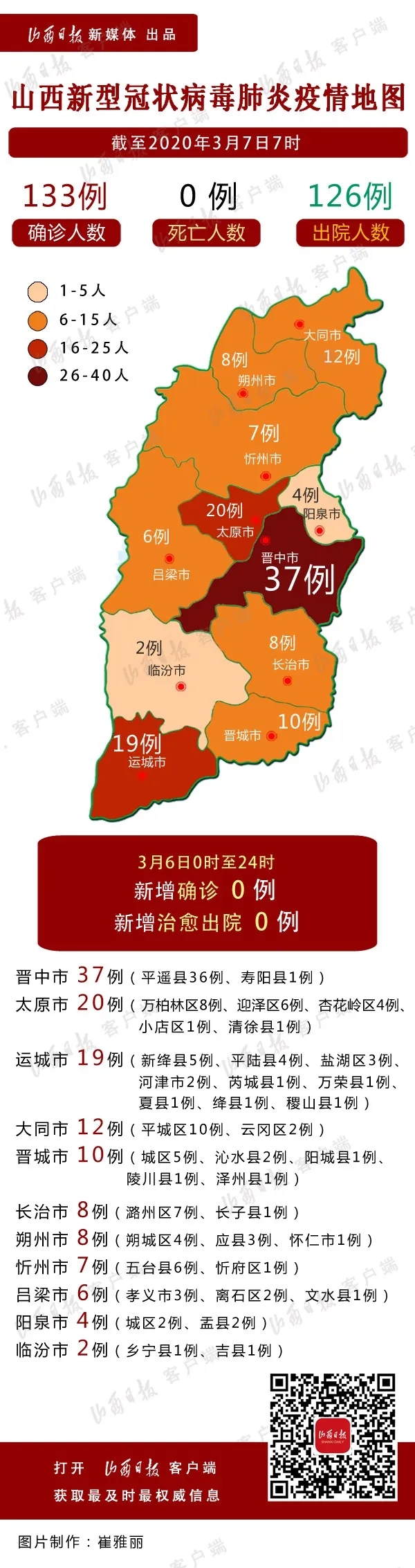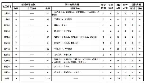 截至3月6日24時(shí),山西省11個(gè)市累計(jì)報(bào)告新型冠狀病毒感染的肺炎確診病例133例。其中: