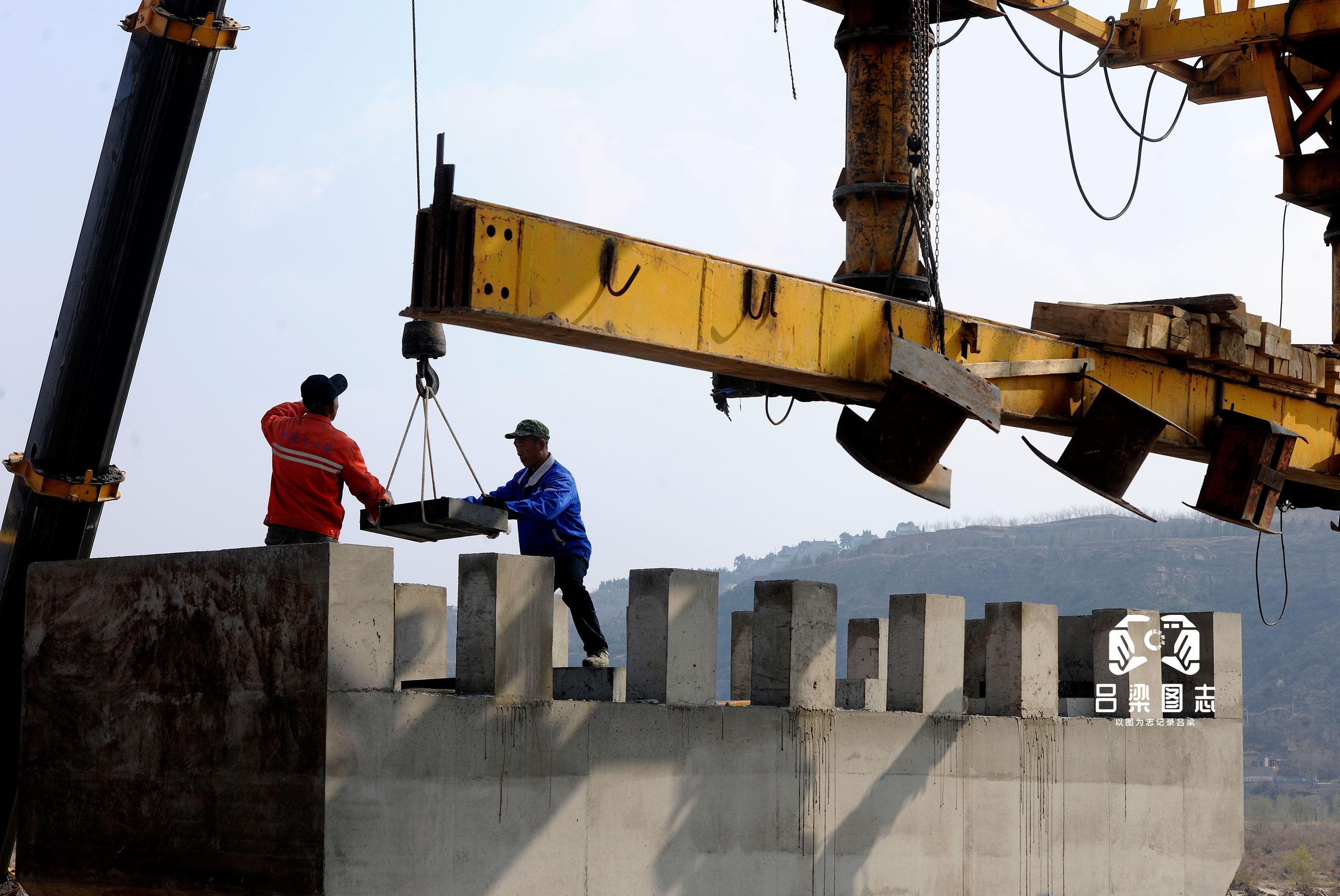 黃河一號旅游公路臨縣克虎段橋梁架設現(xiàn)場,工人正準備架設復工以來的第一根橋梁。記者 劉亮亮 攝影報道