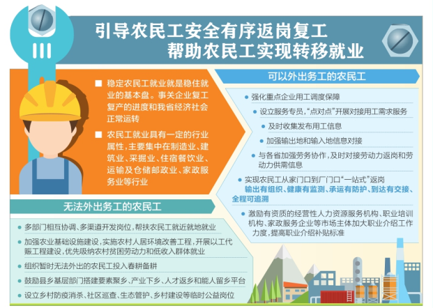 穩(wěn)定農(nóng)民工就業(yè)就是穩(wěn)住就業(yè)的基本盤。農(nóng)民工返崗之路是否暢通、就業(yè)形勢是否穩(wěn)定,不僅直接影響農(nóng)民工的工資性收入特別是貧困勞動力增收脫貧,還事關(guān)企業(yè)復(fù)工復(fù)產(chǎn)的進度和我省經(jīng)濟社會正常運轉(zhuǎn)?! ∪绾我龑?dǎo)農(nóng)民工安全有序返崗復(fù)工,幫助農(nóng)民工實現(xiàn)轉(zhuǎn)移就業(yè)是疫情發(fā)生以來我省穩(wěn)就業(yè)工作和2020年決戰(zhàn)決勝脫貧攻堅的重點工作之一。近日,我省發(fā)布《關(guān)于統(tǒng)籌推進疫情防控和穩(wěn)就業(yè)工作的通知》(以下簡稱《通知》),進一步“引導(dǎo)農(nóng)民工安全有序轉(zhuǎn)移就業(yè)”。