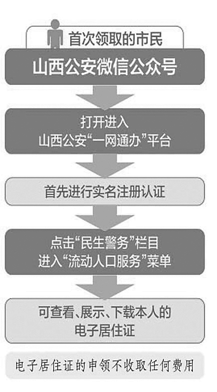 首次領(lǐng)取的市民,只需打開山西公安微信公眾號進(jìn)入山西公安“一網(wǎng)通辦”平臺,實名注冊認(rèn)證后,點擊“民生警務(wù)”欄目,進(jìn)入“流動人口服務(wù)”菜單,即可查看、展示、下載本人的電子居住證。電子居住證的申領(lǐng),不收取任何費用。記者看到,“一網(wǎng)通辦”平臺里的電子居住證登載了流動人口的姓名、性別、民族、人像、公民身份號碼、戶籍所在地、現(xiàn)居住地址、有效期限等信息,并新增了二維碼核驗信息。