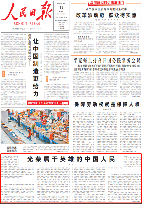 來源:《人民日報》(2020年09月18日第01版),原題:《光榮屬于英雄的中國人民》