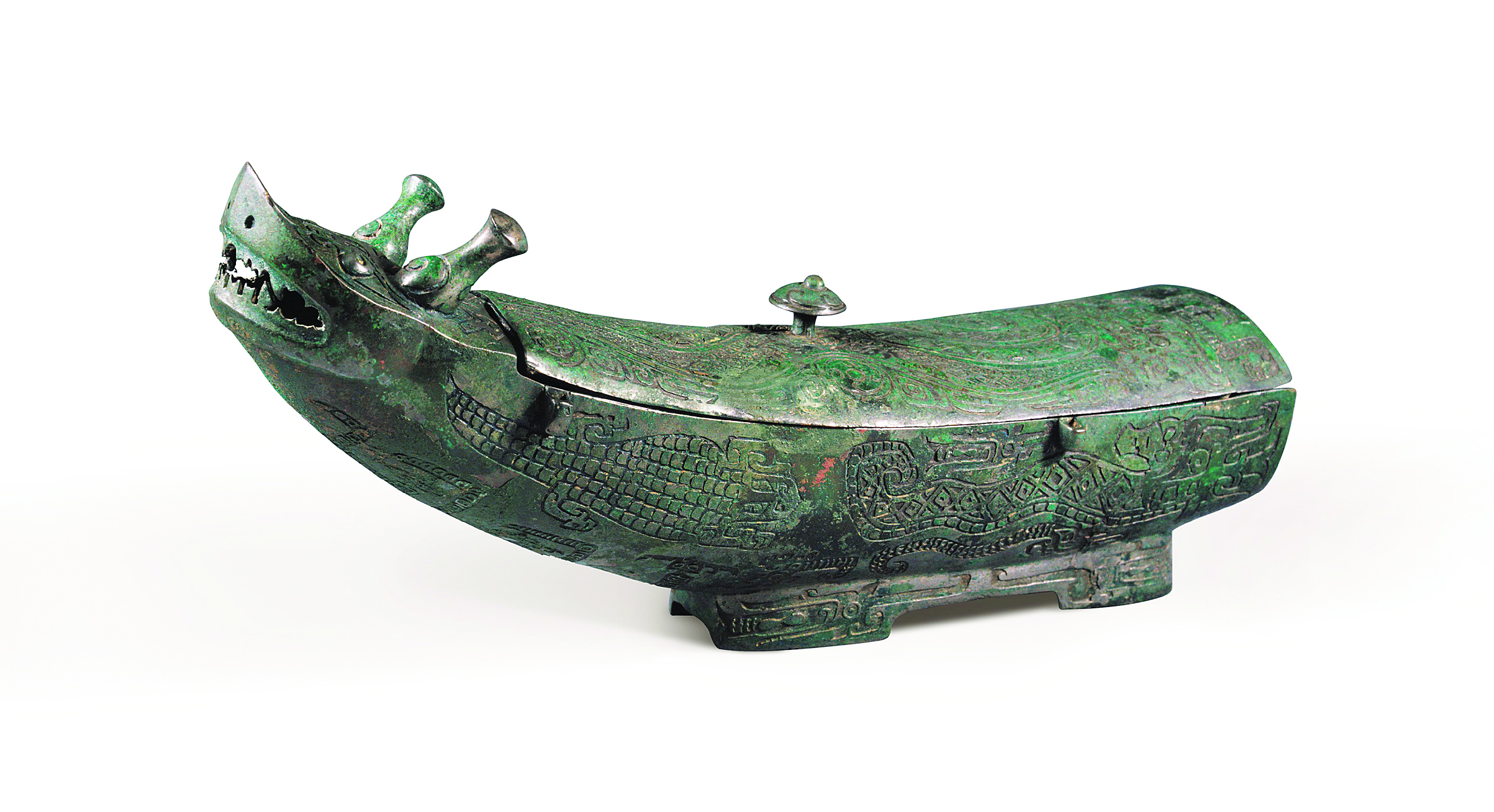 龍形觥從全器形看有些像獸角,前端為龍首形,昂頭翹鼻,口部微張,上下兩排尖尖的鋸齒形牙,利齒畢露,牙齒間隙可注酒,蓋面中央有一蘑菇形鈕,器身口沿外附有兩對(duì)貫耳,用來把龍形觥吊起加熱酒,另一端沒有封口是用來散水蒸氣的,器物底部有長方形矮圈足,放置平穩(wěn),造型獨(dú)特,獨(dú)具風(fēng)采。器身遍飾華麗精美的圖案,蓋面為逶迤的龍身,與器物前端的龍頭相銜接,兩側(cè)裝飾有鱷魚、夔龍。在栩栩如生的紋飾裝點(diǎn)下,龍形觥整體婉如一艘停泊在水波里的龍舟。但最令人費(fèi)解的是,這件出土于山西西部黃河沿岸石樓縣的3000多年前商代的青銅器上,極為罕見出現(xiàn)了鱷魚紋飾,莫非,當(dāng)時(shí)地處黃土高原上石樓縣的氣候溫暖濕潤,沼澤遍地,鱷魚徜徉?