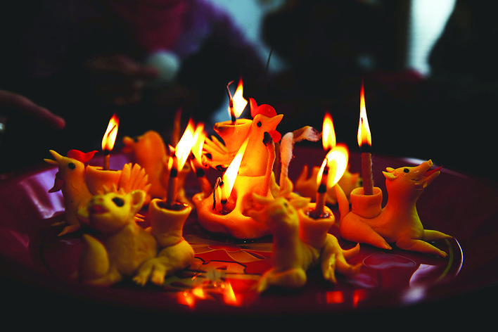 “點遍燈,燒遍香,家家糧食填滿倉。”3月8日是農(nóng)歷正月二十五填倉日。這一天,嵐縣家家戶戶用糕面給家庭成員捏一盞生肖燈,并準(zhǔn)備一個“滿堂紅”。當(dāng)夜晚來臨,將糕面燈注油點燃放置各處,由于“燈”和“登”諧音,“糕”和“高”諧音,在填倉日點燈燈也寄托了大家祈求五谷豐登,糧倉升高的美好愿景。