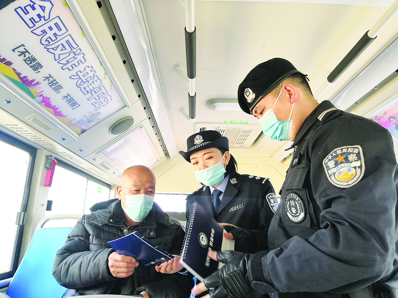 圖為市公安局反詐宣傳民警為市民講解反詐知識(shí)。2月份以來(lái),市區(qū)部分公交車車身?yè)Q上全新的反詐公益廣告,車廂內(nèi)部擺放各類典型詐騙套路宣傳單,更有反詐宣傳民警與乘客面對(duì)面答疑解惑。連日來(lái),首批反詐主題公交車陸續(xù)駛出呂梁市長(zhǎng)途汽車站,在為市民提供出行服務(wù)的同時(shí),以特殊的方式喚醒民眾的防騙意識(shí)。沿途乘客可以利用坐公交車的碎片時(shí)間,隨時(shí)獲取反詐防詐小知識(shí),提升全民防騙意識(shí)。
